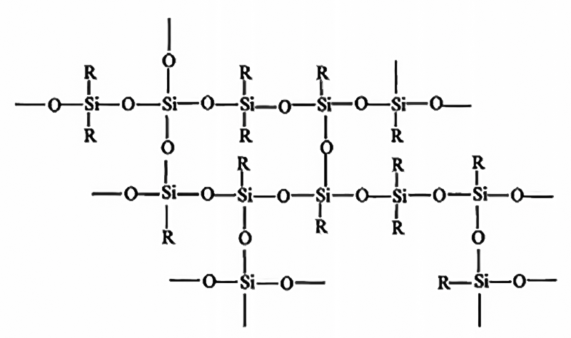 硅树脂是高度交联的网状结构的聚有机硅氧烷,通常是用甲基三氯硅烷、二甲基二氯硅烷、苯基三氯硅烷、二苯基二氯硅烷或甲基苯基二氯硅烷的各种混合物,在有机溶剂如甲苯存在下,在较低温度下加水分解,得到酸性水解物。水解的初始产物是环状的、线型的和交联聚合物的混合物,通常还含有相当多的羟基。水解物经水洗除去酸,中性的初缩聚体于空气中热氧化或在催化剂存在下进一步缩聚,最后形成高度交联的立体网络结构。